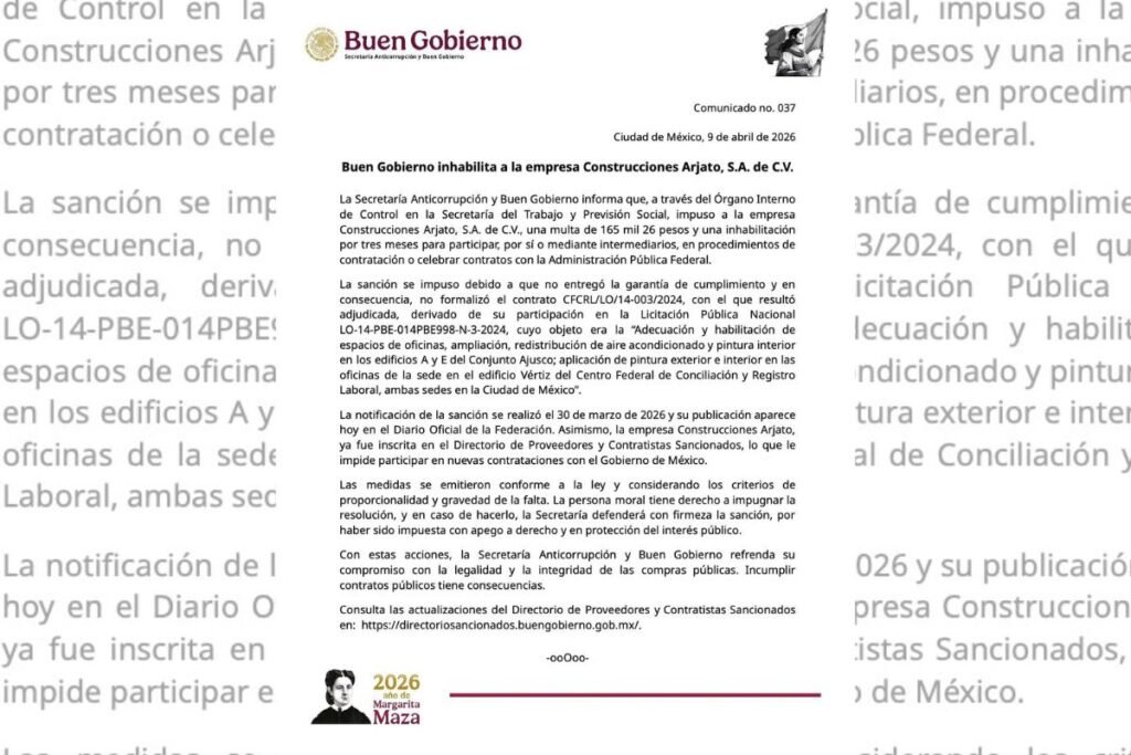De acuerdo con la dependencia, la sanción, notificada el 30 de marzo de 2026 y publicada hoy en el Diario Oficial de la Federación (DOF), se debió a que la empresa no entregó la garantía de cumplimiento del contrato CFCRL/LO/14-003/2024, adjudicado tras su participación en la Licitación Pública Nacional LO-14-PBE-014PBE998-N-3-2024. Dicho contrato tenía como objeto la “Adecuación y habilitación de espacios de oficinas, ampliación, redistribución de aire acondicionado y pintura interior en los edificios A y E del Conjunto Ajusco; aplicación de pintura exterior e interior en las oficinas de la sede en el edificio Vértiz del Centro Federal de Conciliación y Registro Laboral, ambas sedes en la Ciudad de México“.