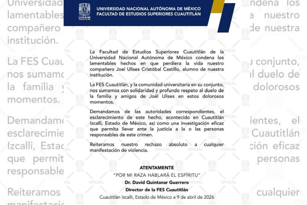 “Reiteramos nuestro rechazo absoluto a cualquier manifestación de violencia”, señala el comunicado, firmado por el Dr. David Quintanar Guerrero, Director de la FES Cuautitlán.