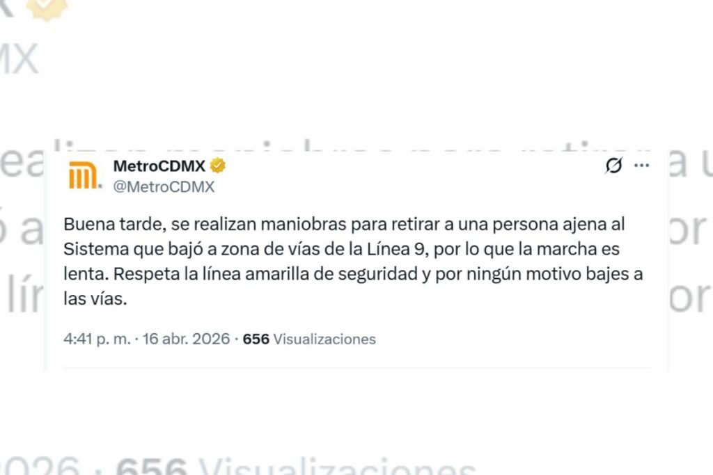 “Buena tarde, se realizan maniobras para retirar a una persona ajena al Sistema que bajó a zona de vías de la Línea 9, por lo que la marcha es lenta. Respeta la línea amarilla de seguridad y por ningún motivo bajes a las vías”, indicó el Metro en su cuenta de X.
