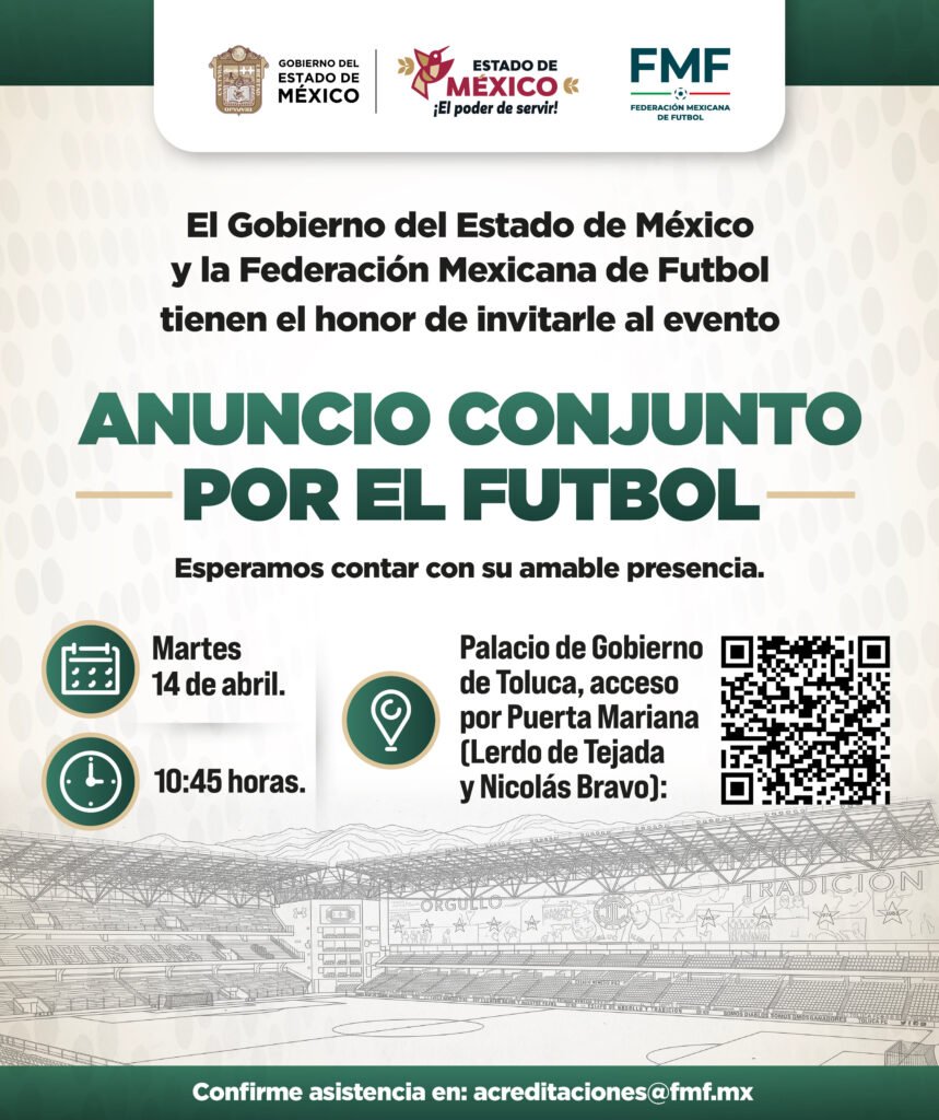 En un esfuerzo por fortalecer los vínculos entre las instituciones del Gobierno del Estado de México y la Federación Mexicana de Futbol (FMF) realizarán el evento “Anuncio Conjunto por el Fútbol”. El encuentro tendrá lugar este martes 14 de abril a las 10:45 horas en el Palacio de Gobierno de Toluca. La logística del evento, será coordinada bajo los protocolos de acceso por la Puerta Mariana (ubicada en Lerdo de Tejada y Nicolás Bravo).