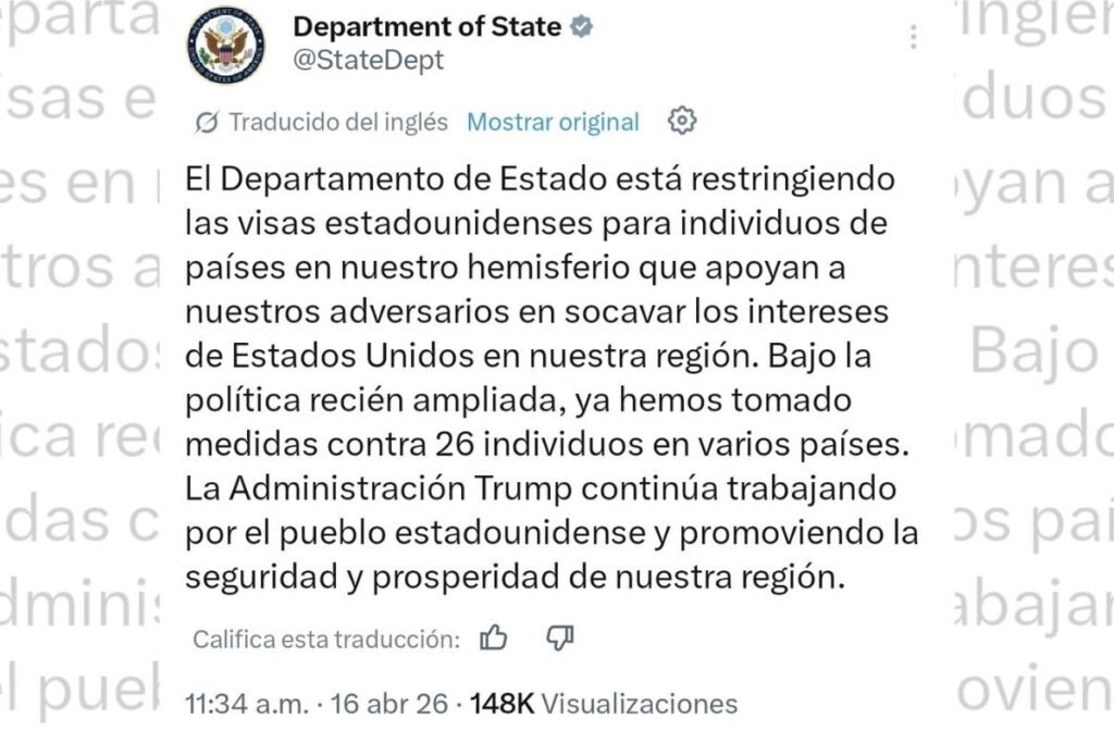 El Departamento de Estado de Estados Unidos anunció el endurecimiento de las restricciones de visa para individuos de países del hemisferio que apoyen a adversarios en socavar los intereses estadounidenses en la región. La medida, parte de una política recientemente ampliada, ya ha resultado en acciones contra 26 personas en varios países.