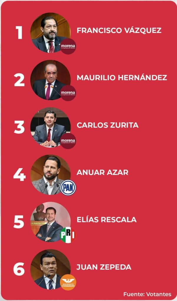 En segundo lugar aparece Maurilio Hernández (Morena), reconocido por su trabajo en reformas de justicia y educación, seguido por Carlos Zurita (Morena), quien ha impulsado iniciativas de innovación digital y atención a grupos sociales.