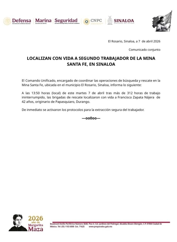 Horas más tarde, el Comando Unificado reportó que a las 10:36 horas de este miércoles 8 de abril, Francisco Zapata Nájera, fue rescatado con éxito de la mina Santa Fe, en El Rosario, Sinaloa.